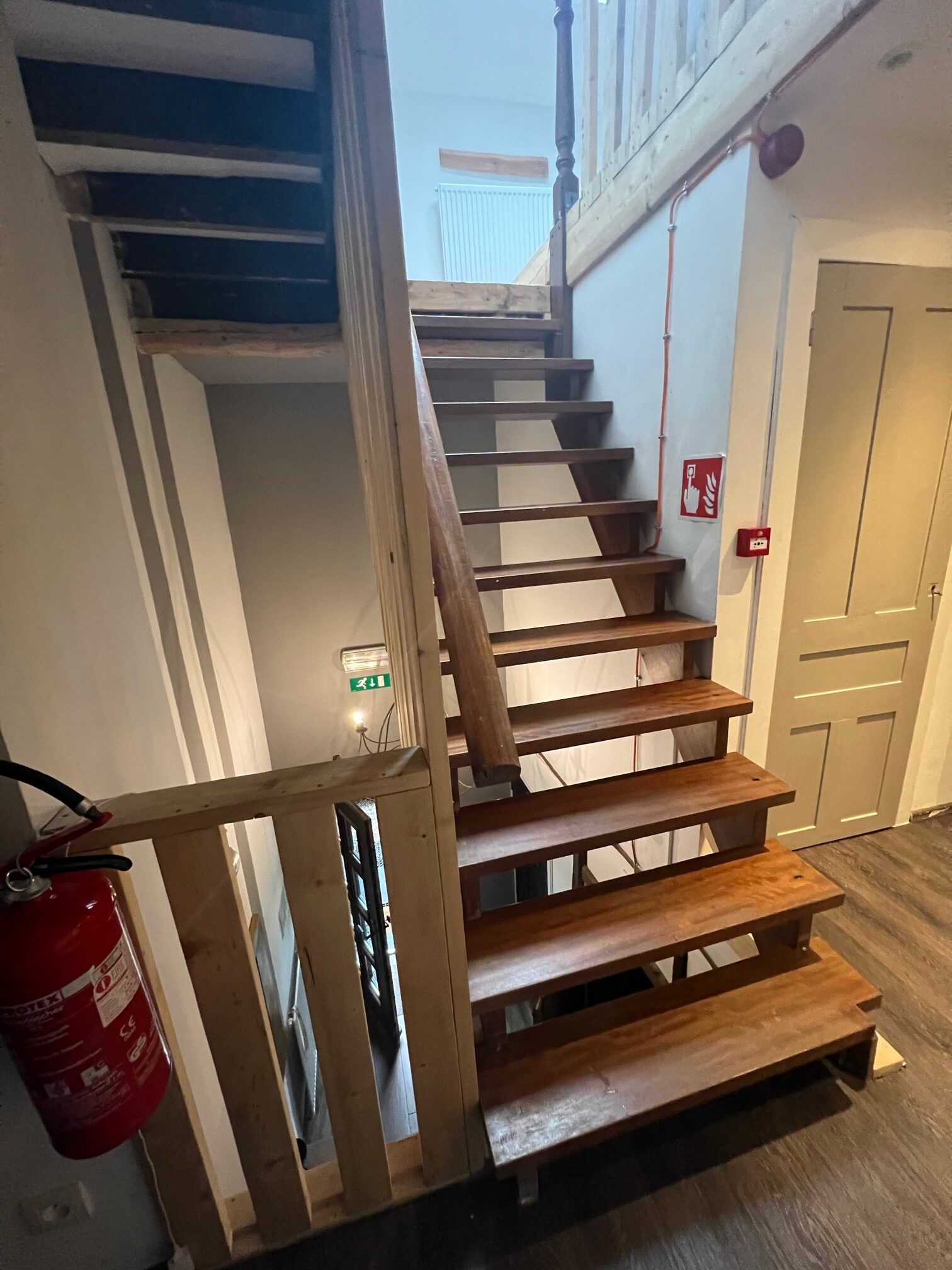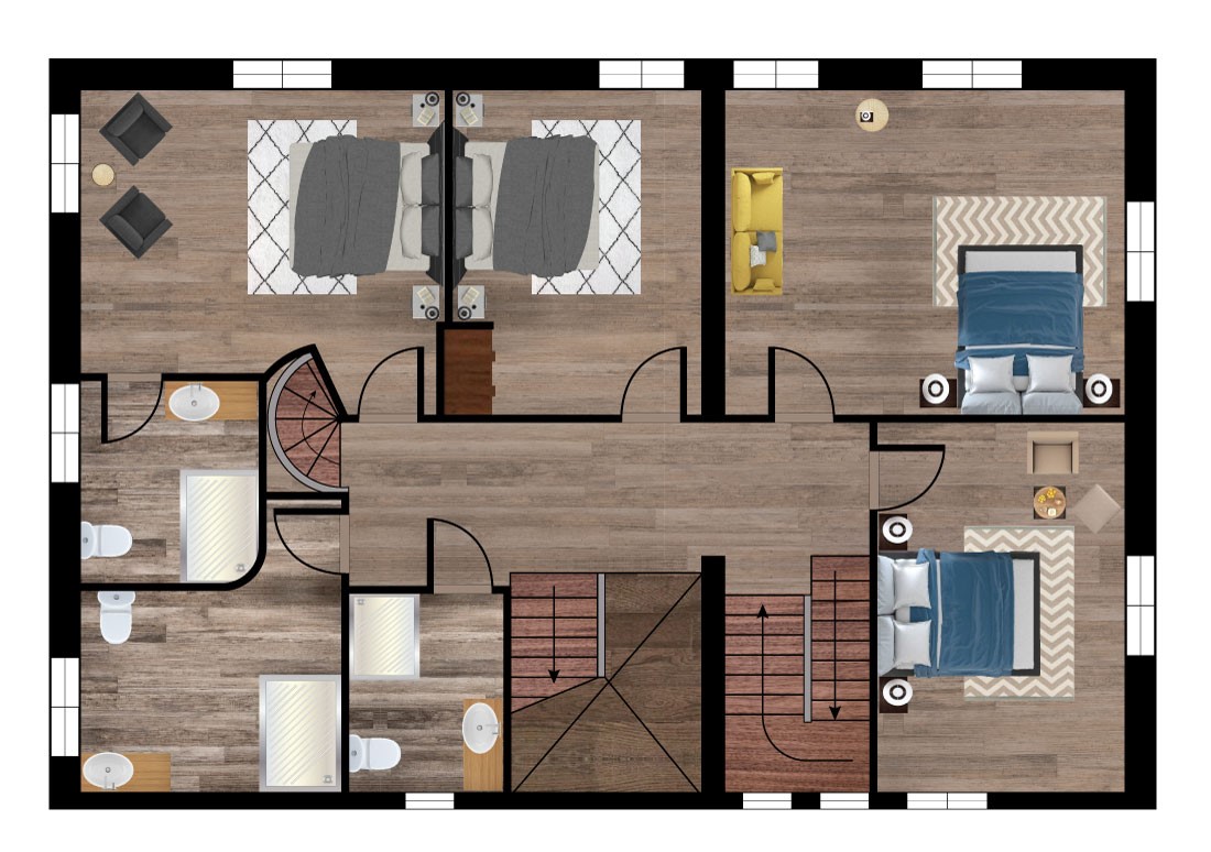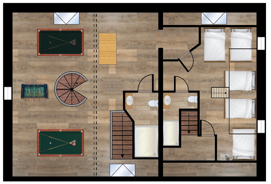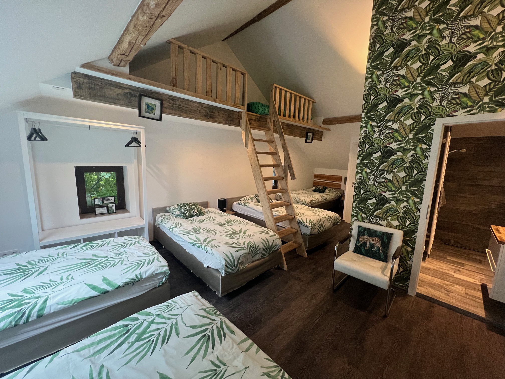 • The second floor has a large bedroom with six large single beds and a private bathroom.